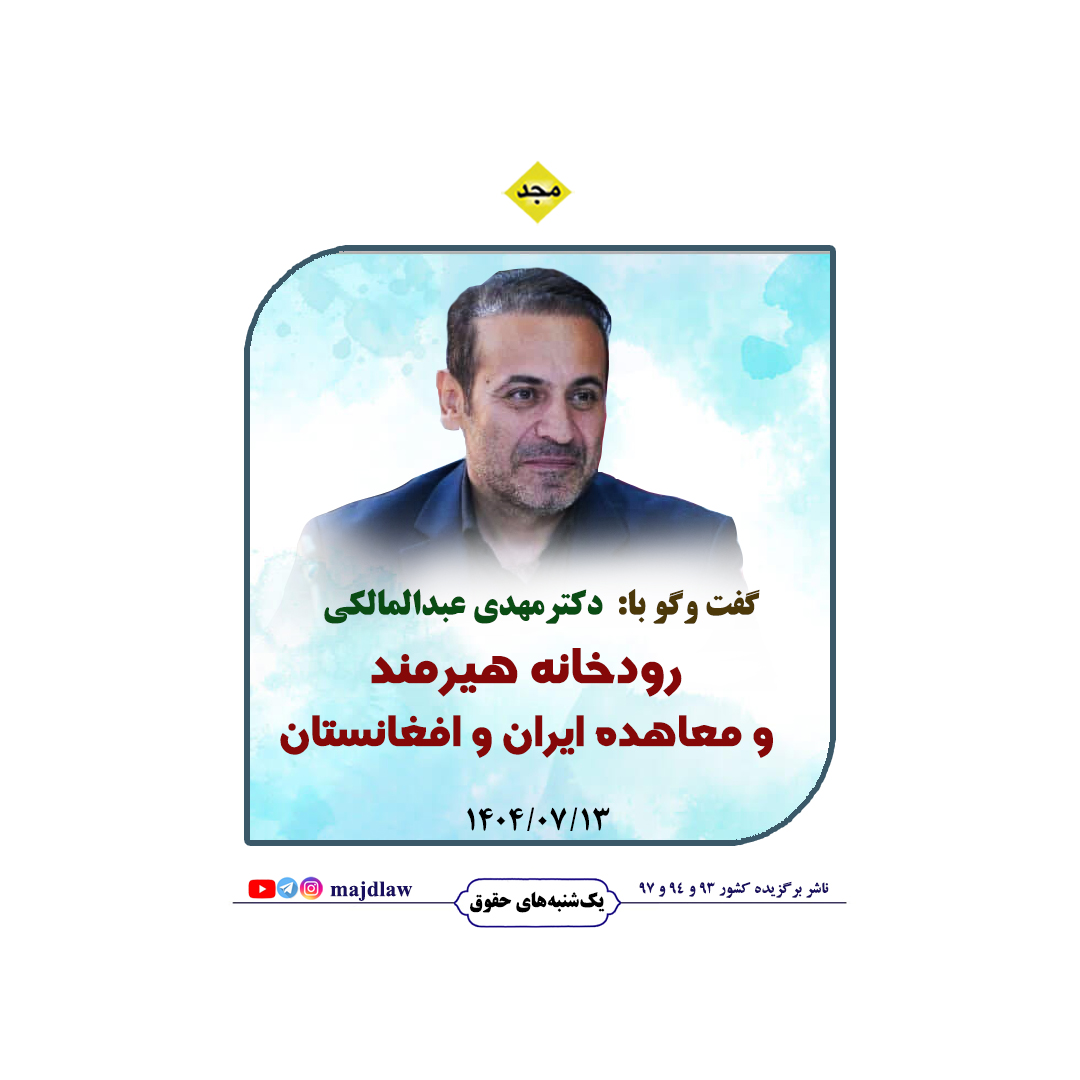 ⚖️ رودخانه هیرمند؛ معاهده ایران و افغانستان | گفتوگو با دکتر مهدی عبدالمالکی 🎥 یکشنبههای حقوق مجد | قسمت ۱۵۷ در این گفتوگوی علمی و تحلیلی، دکتر مهدی عبدالمالکی — دانشآموخته دکتری و پژوهشگر حقوق بینالملل — به بررسی ابعاد تاریخی، حقوقی و انسانی حقآبه ایران در رودخانه هیرمند و معاهده ۱۳۵۱ میان ایران و افغانستان میپردازد. «حقوق بینالملل آب آن دسته از قواعد و اصول است که به استفاده...